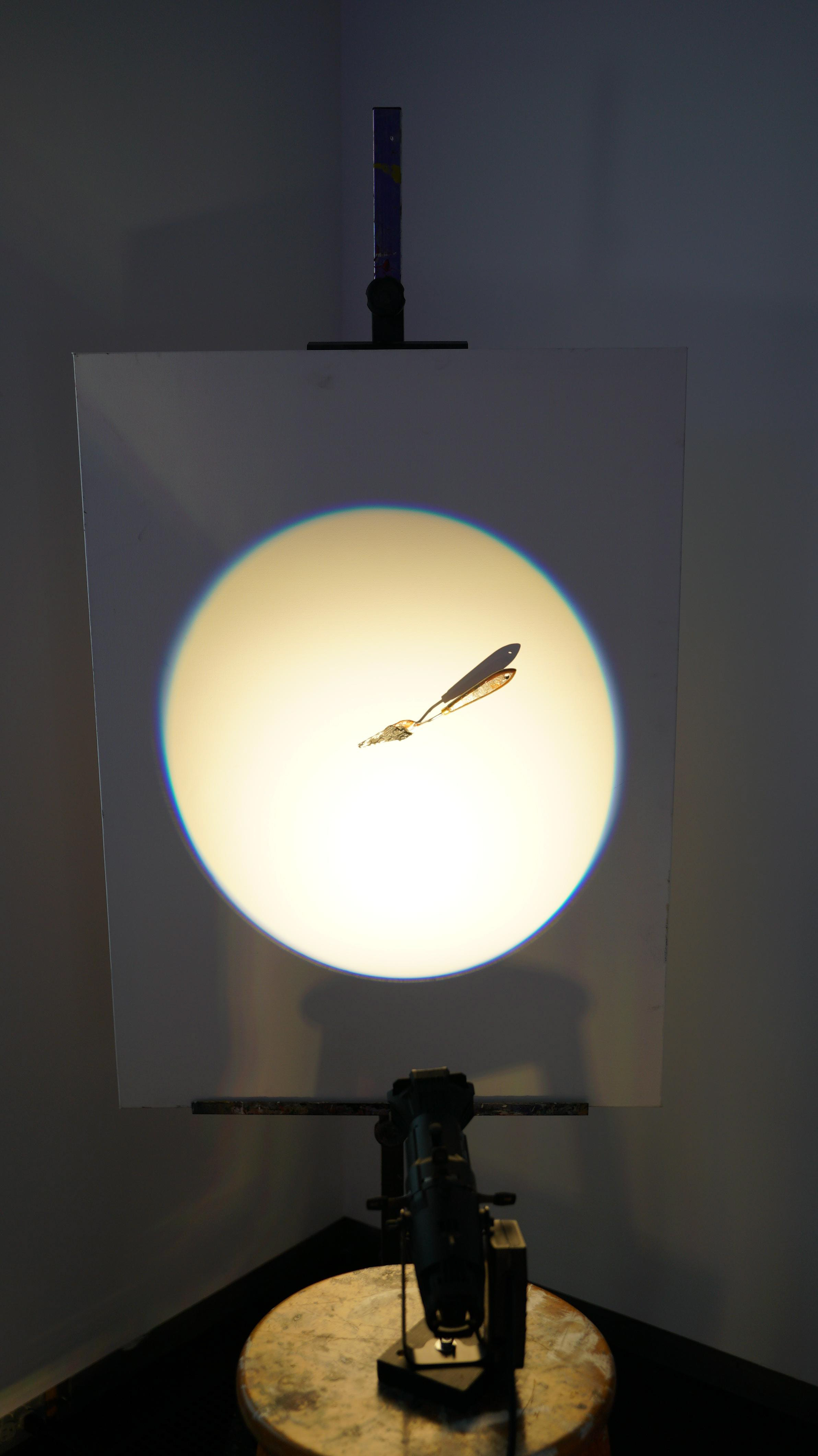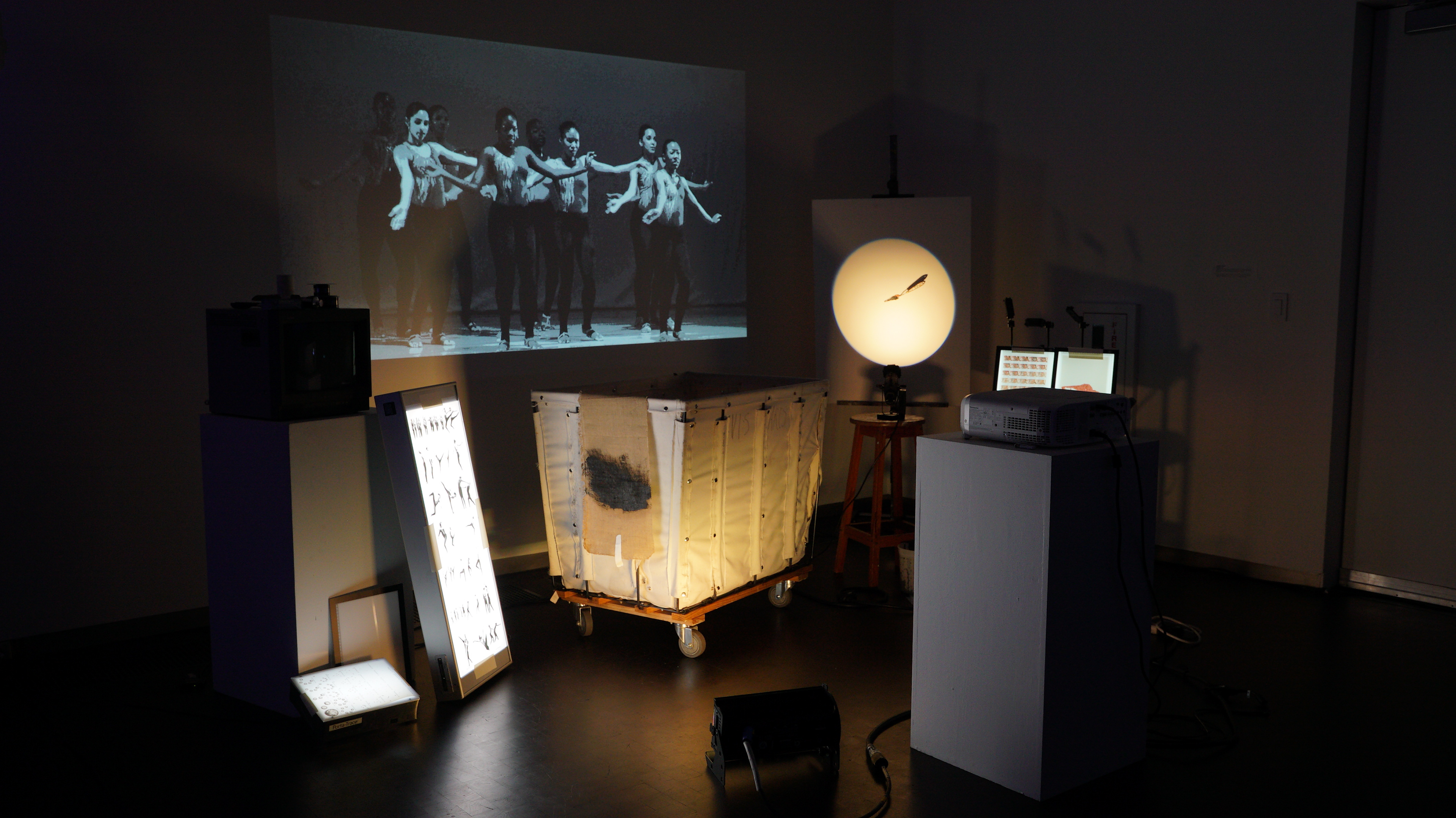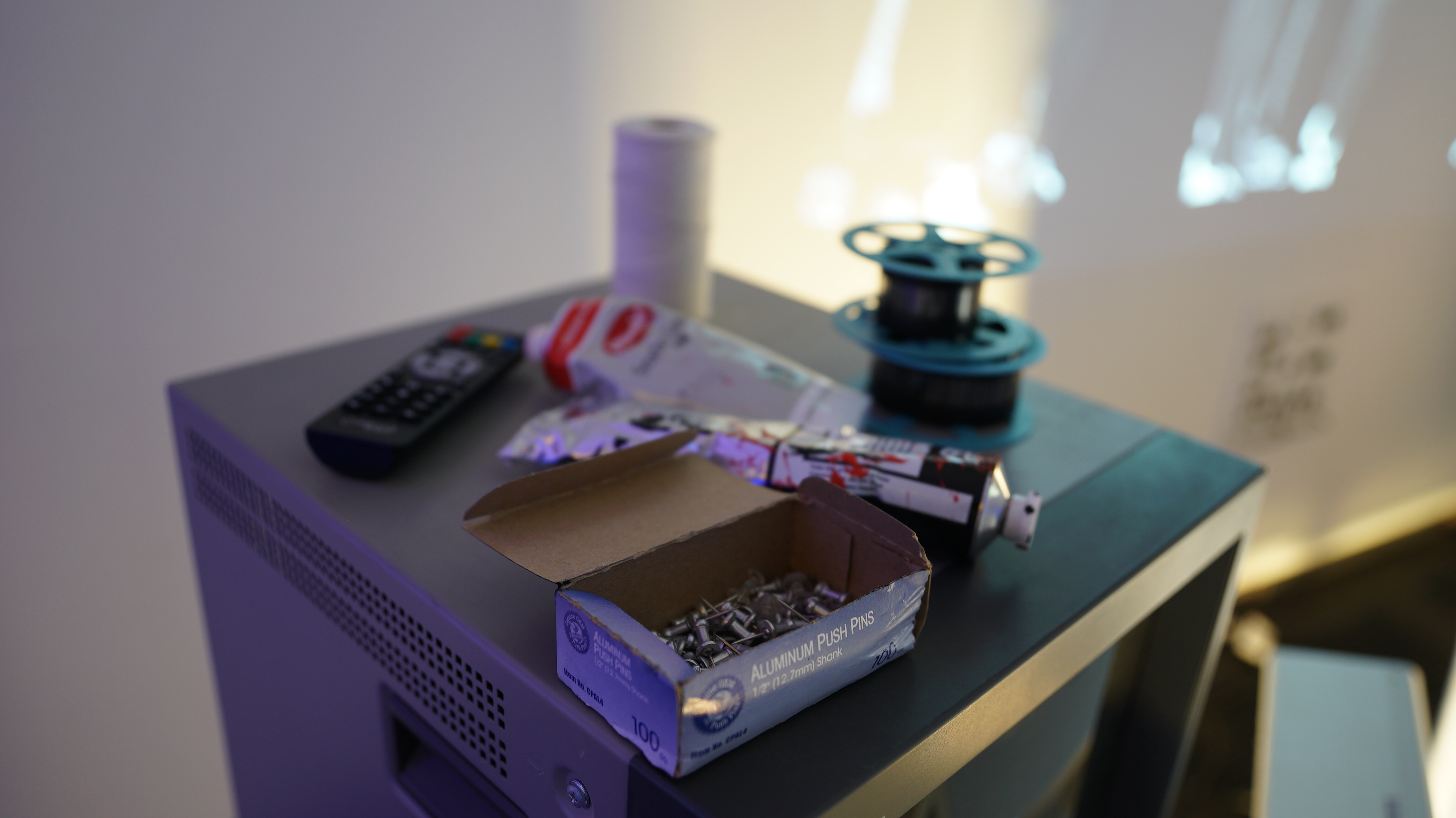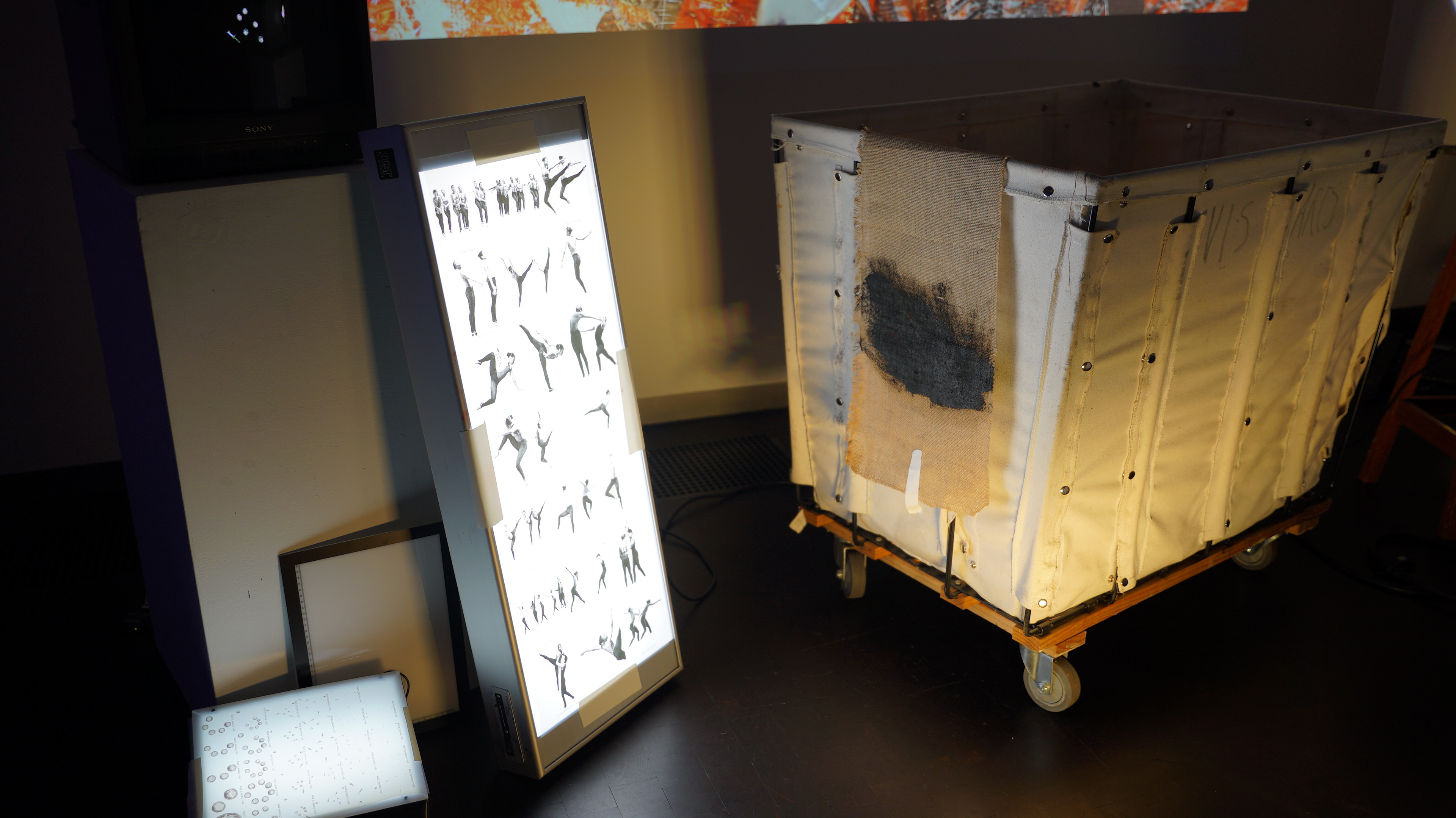 1-channel projection, 1-channel CRTV, variety of photography lightboards, automated contact sheets, moving hamper, rolling cart, extension cords, canvas, easel, metal pins, microfilm reels, acrylic paint, scraper, Kodak mini projectors, X-acto knives, and personal items courtesy of the artist.