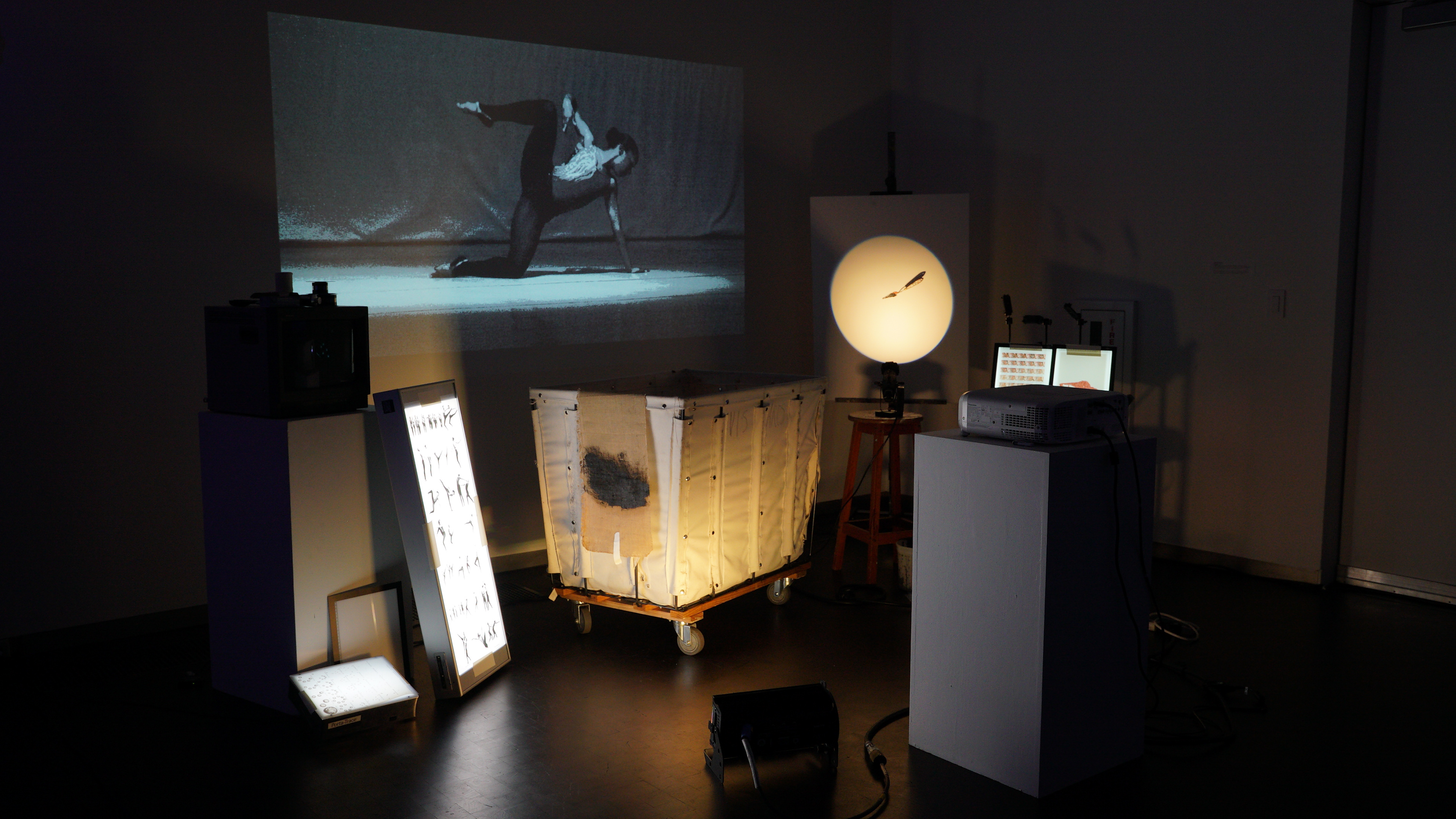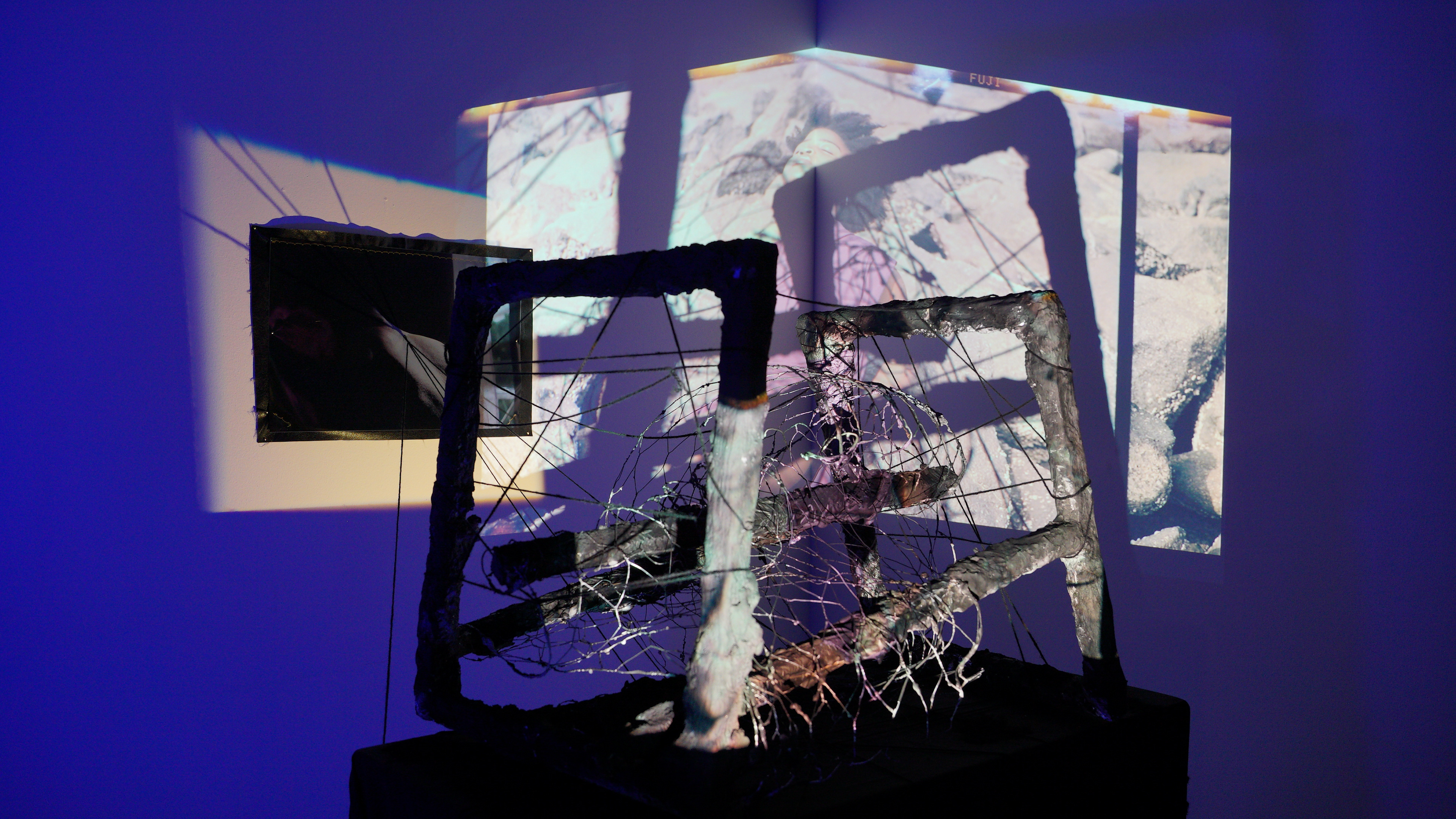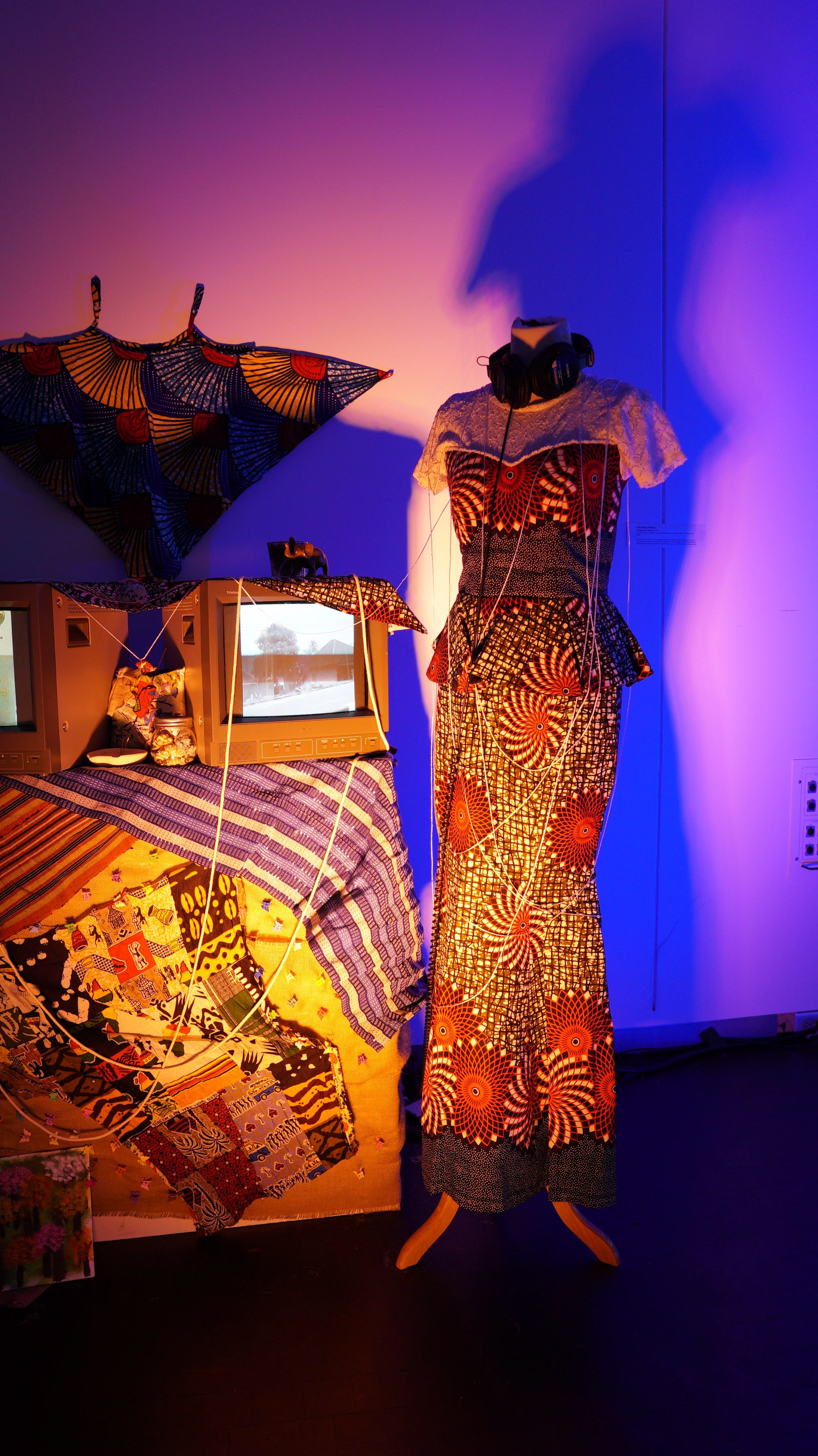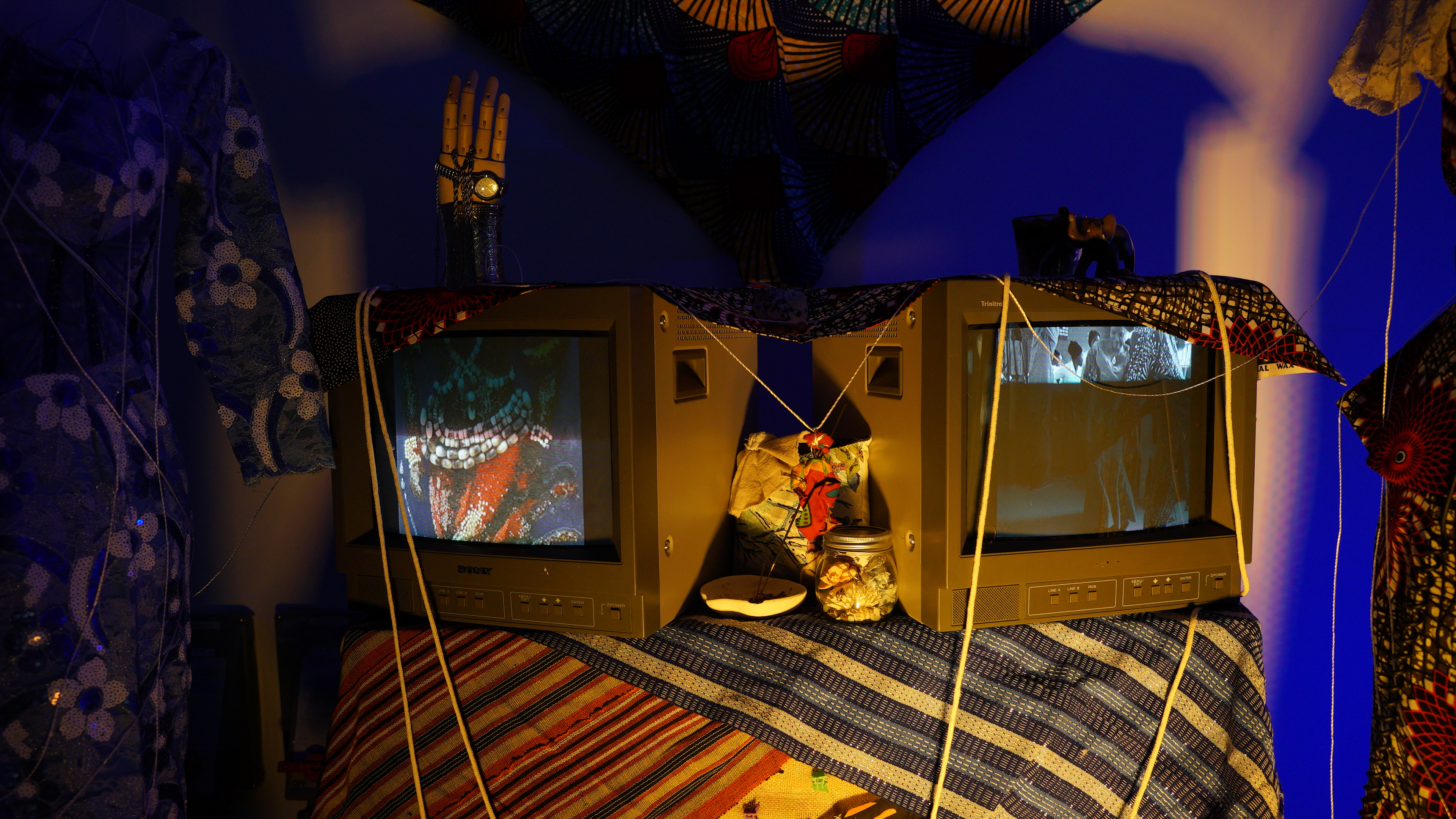 2-channel video, pedestal, dressed mannequins and personal items courtesy of the artist.