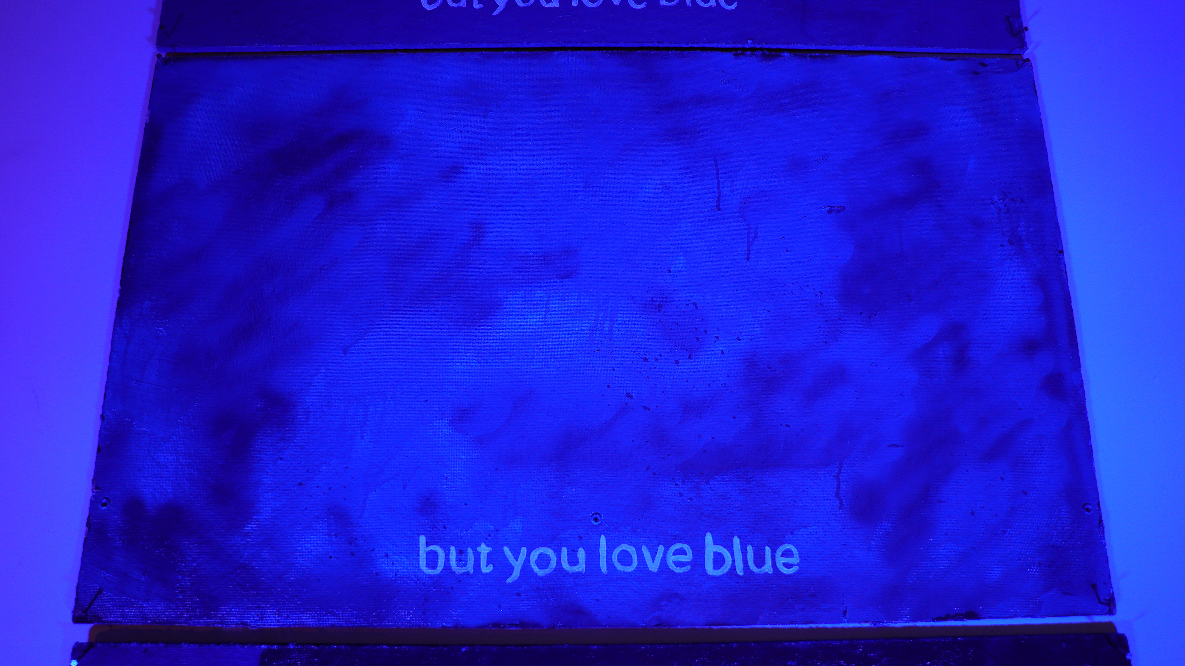 Projection on spray painted wood frame, analog 35mm on transparent film, leather sheet, yarn, charcoal. 51 seconds total.
